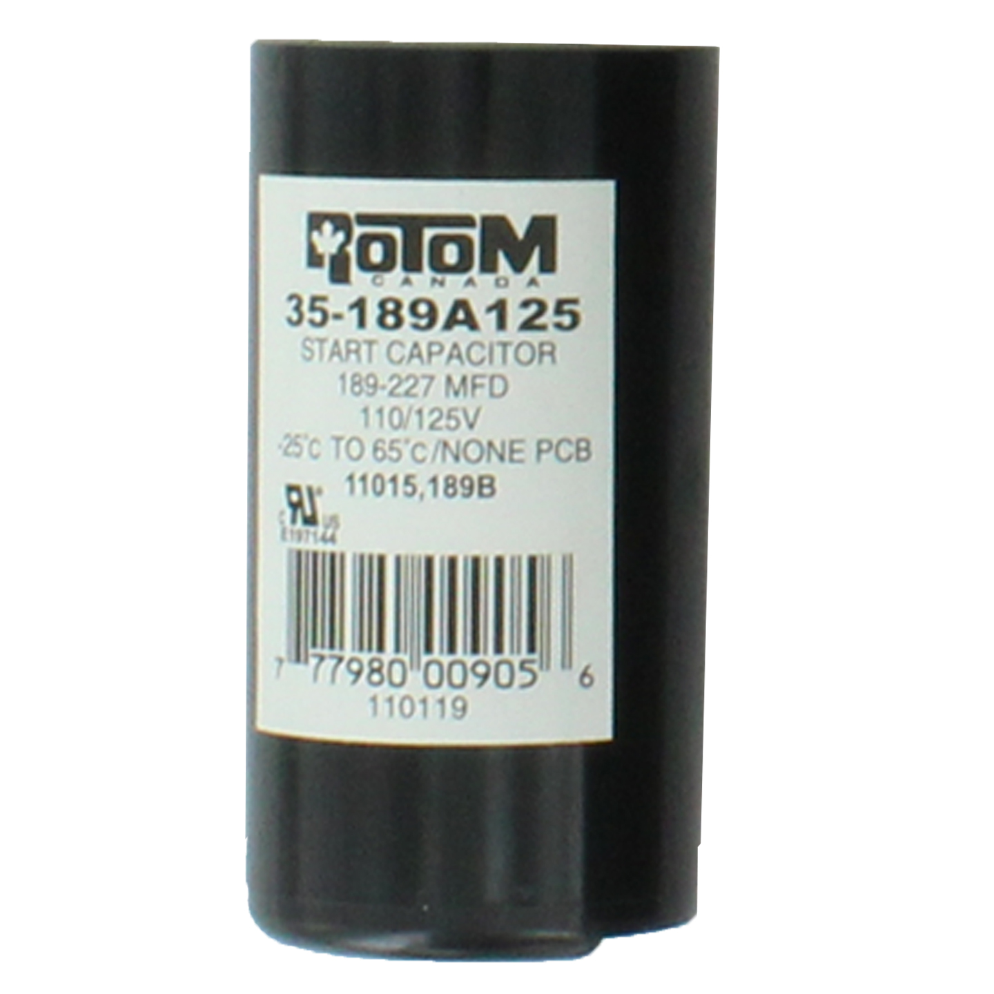 Electrolytic motor start capacitor, 124–149 microfarads, 250 Volt AC working voltage. Intended for intermittent-duty motor starting on single-phase induction motors in HVAC, pump, and compressor applications.